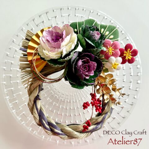 『お正月飾り2026年Ver.』のご案内です毎年ご好評いただいておりますお正月飾り2026年版は、クレイで作った葉牡丹と可愛い和小物でアレンジしています。 なお、過去にお作りしたデザインにつきましてもご依頼承りますのでお問合せ下さい。(資材調達の都合、類似品での制作になる場合がございます。予めご了承下さい。) レッスン
